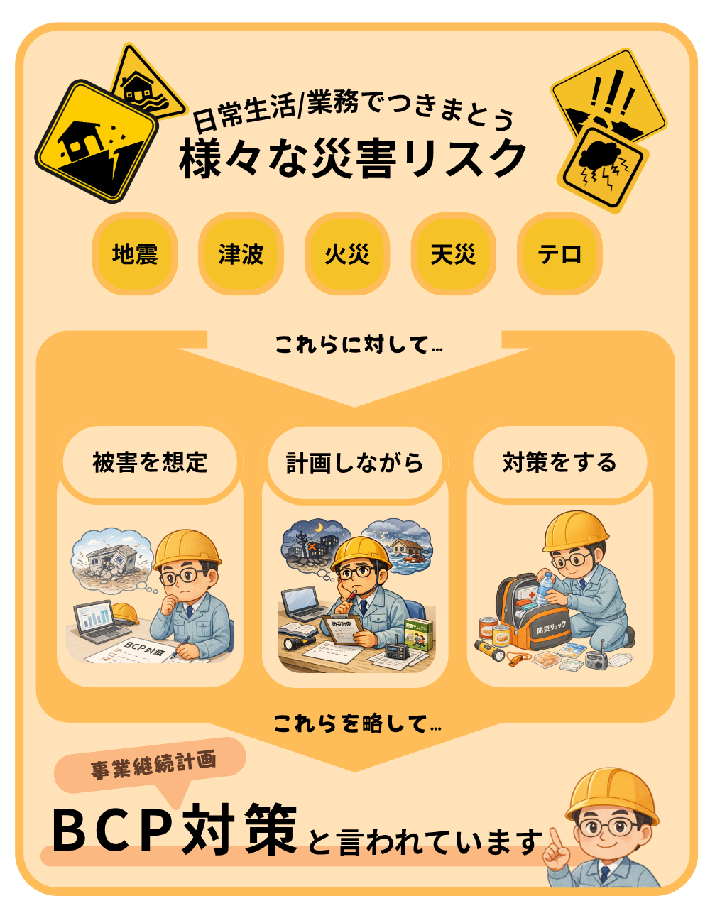 「地震」「火災」「津波」などの自然災害や、 システム障害・テロといった予期せぬトラブルが起きたときに、 どれだけ被害を小さくできるか、 そしてできるだけ早く事業を立て直せるか。 そのために、あらかじめ考え、決めておく取り組みがBCP対策です。